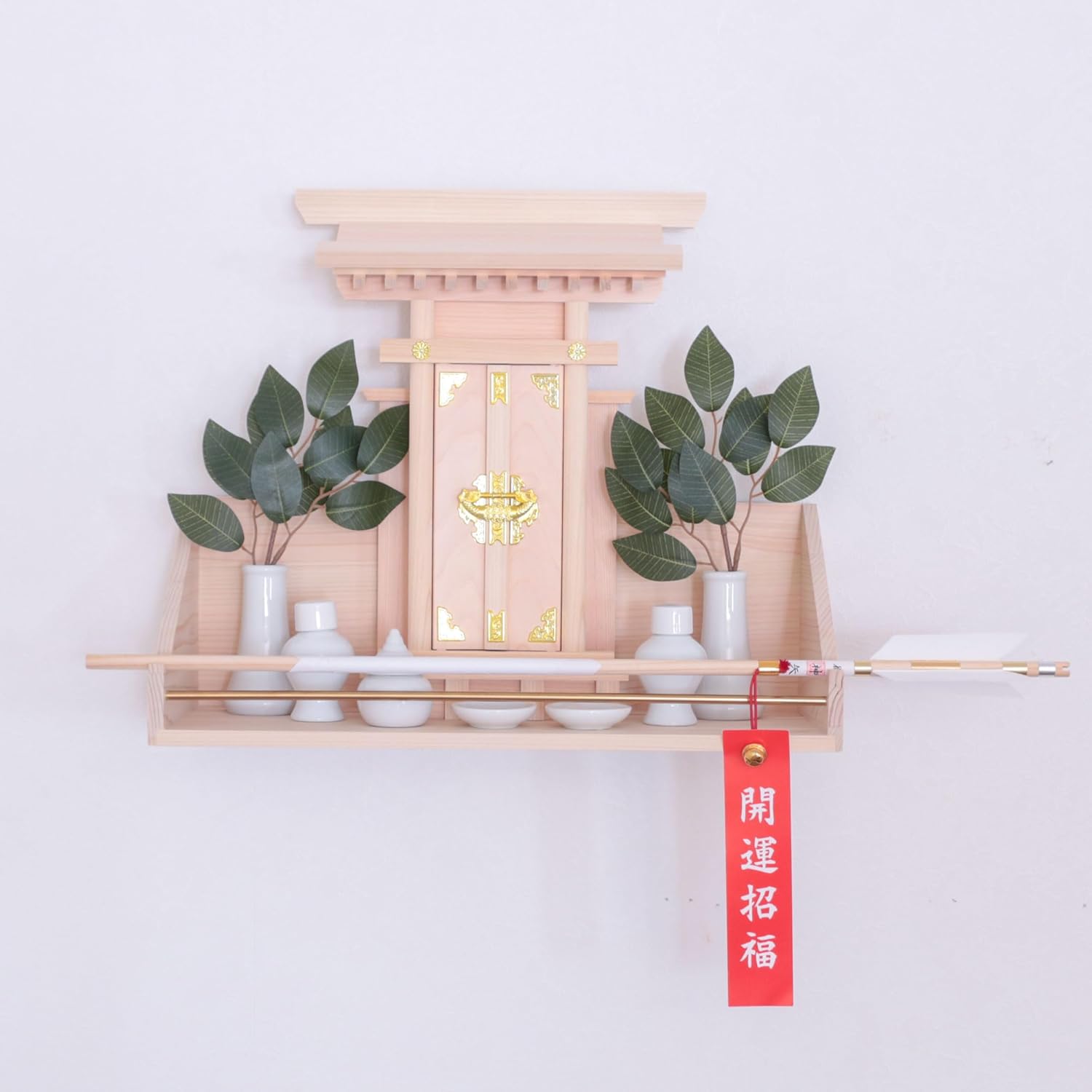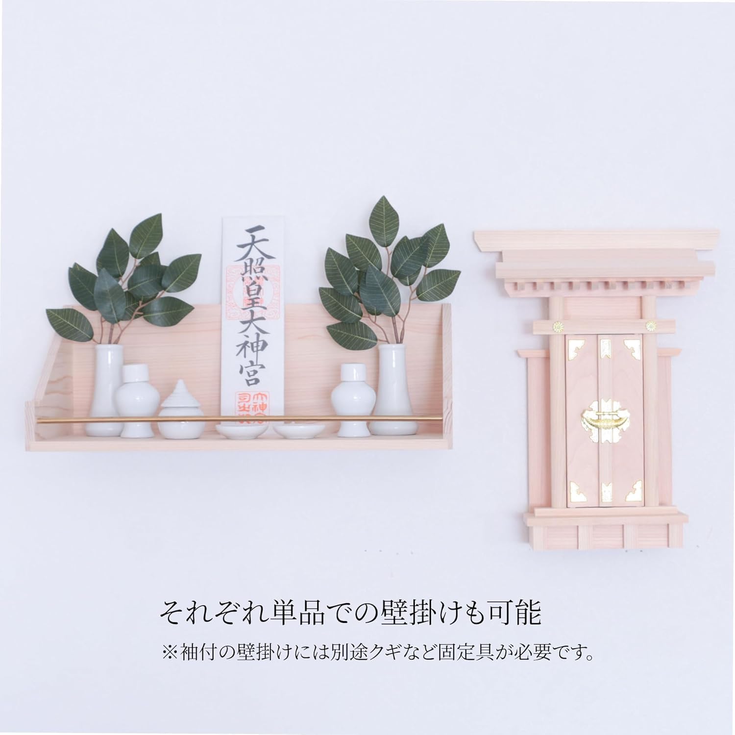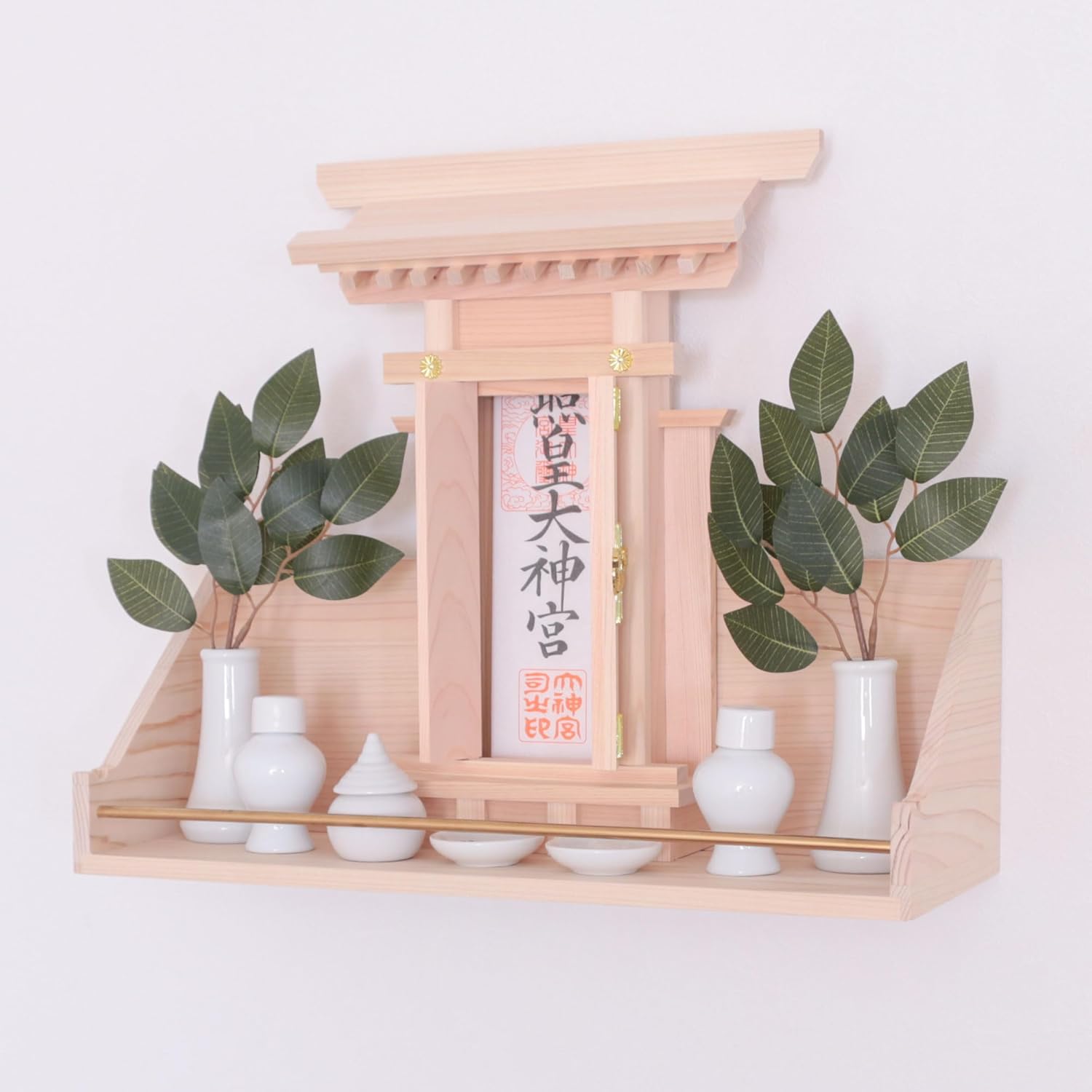 | 担当者より一言 | お神札をお祀りしたいけど、場所を取りたくないし大きな穴もあけたくない… そんな時はこのセットをおすすめします。 付属の石膏ボード用壁掛けピンは取り付け後も穴が目立たず、奥行きもあるので置き型としても使えます。 前面には破魔矢を収納できるくぼみと、神具の滑り落ち防止のバーも設置しており耐震面も優れます。 神棚、神棚板それぞれ別々で使用することもできるため、用途や状況によってお祀り方法を 自由に変えられる便利なセットです。 お供え物含めて神具一式も付属しているため、届いてすぐにお祀りが始められます。 |
